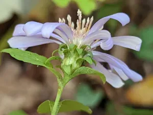 Symphyotrichum retroflexum is a perennial herbaceous plant known for its showy lavender composite flowers with yellow centers, blooming from late summer to fall.