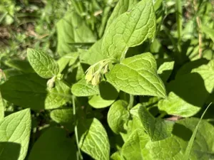 Bulbous Comfrey (Symphytum Bulbosum) is a perennial herb in the Boraginaceae family with moderate care difficulty. It requires moderate watering and partial shade or full sun light in USDA hardiness zones 5-8. This plant is toxic to cats and dogs — keep it out of reach of pets.