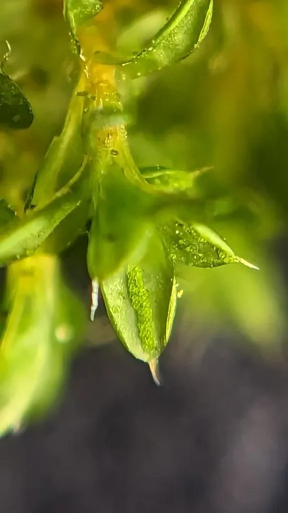 Syntrichia papillosa is a small moss species characterized by its broadly spathulate leaves, which are 2.0-2.5 mm long with an obtusely acute to rounded apex and plane margins.
