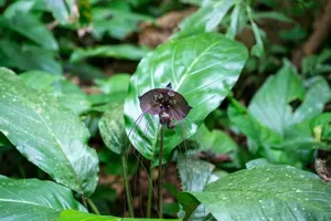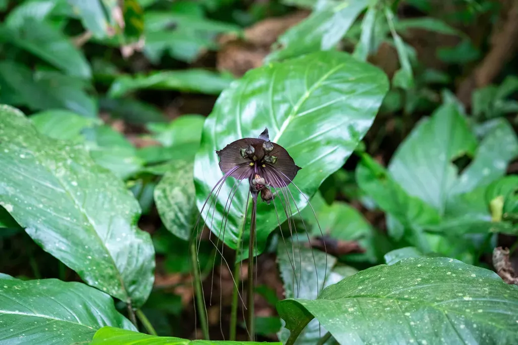 Tacca chantrieri is a tropical herbaceous perennial known for its unique black bat-shaped flowers and long whisker-like bracts.