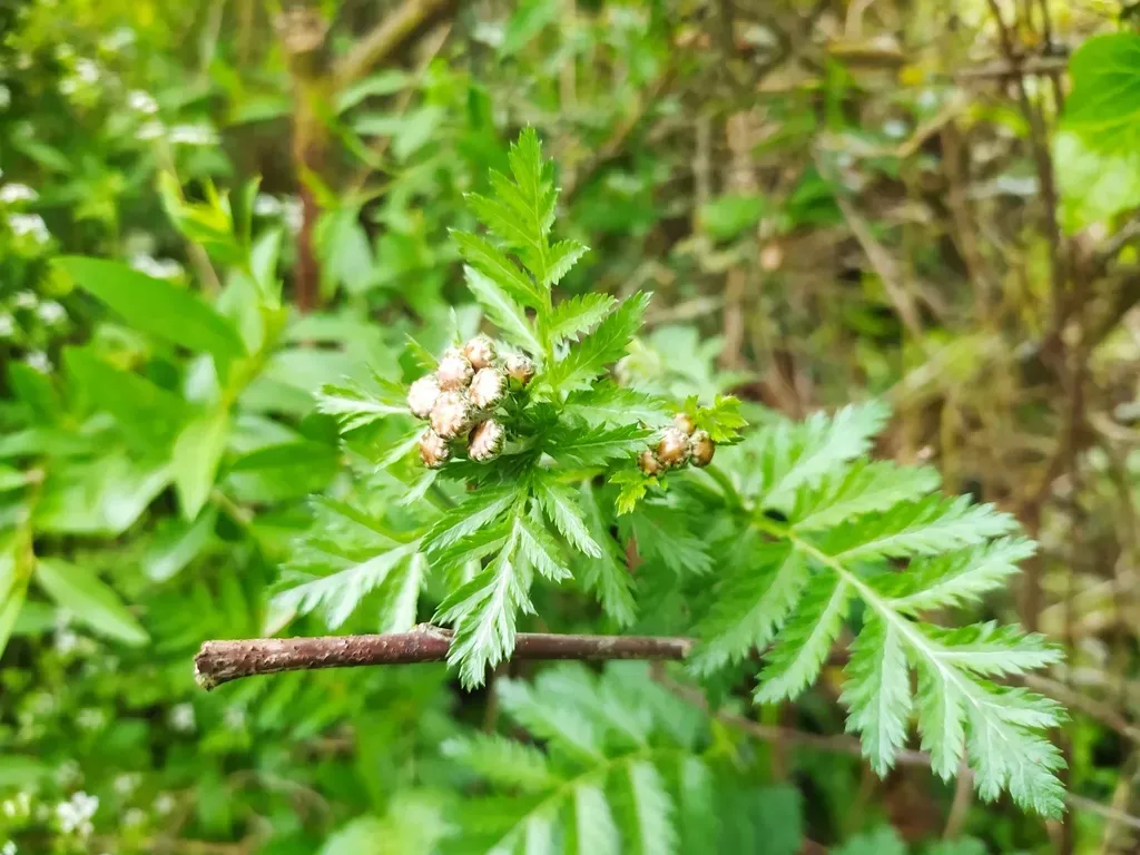 Tanacetum corymbosum is a perennial herbaceous plant with upright, hairy stems and deeply divided dark green leaves, bearing clusters of white, daisy-like flowers.