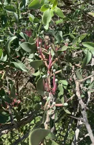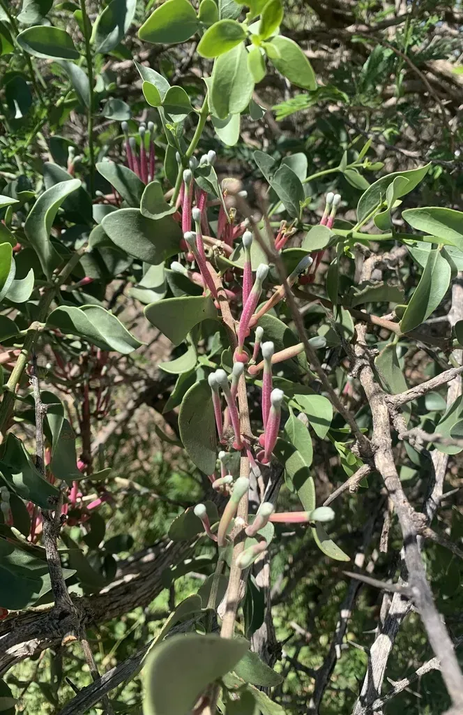 A parasitic shrub native to southern tropical and southern Africa, known for its leathery, lanceolate leaves and its hemiparasitic growth on various host trees.