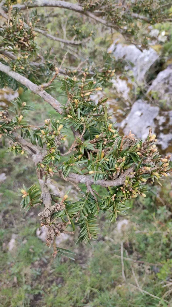 Taxus baccata is a long-lived, evergreen coniferous tree or large shrub native to Europe, known for its dense, dark green foliage and bright red berry-like arils.