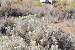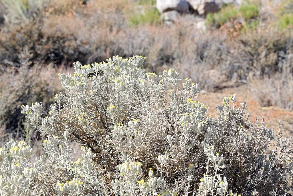 Mojave Cottonthorn (Tetradymia Stenolepis) is a perennial shrub in the Asteraceae family with moderate care difficulty. It requires drought-tolerant watering and full sun light in USDA hardiness zones 8-11. This plant is toxic to cats and dogs — keep it out of reach of pets.