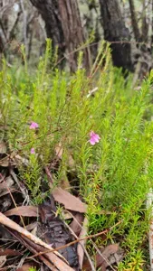 Tetratheca thymifolia is a small shrub native to southeastern Australia, known for its attractive pink bell-shaped flowers with dark centers.