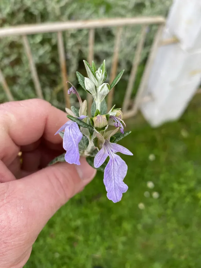 Teucrium fruticans is a spreading evergreen shrub known for its aromatic gray-green leaves and pale blue flowers.