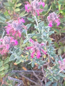 Teucrium marum is a compact, evergreen shrub with aromatic, small oval grey-green leaves and tiny reddish-pink flowers.