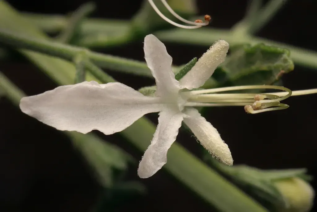 A perennial herb with four-sided, densely hairy stems, narrow egg-shaped leaves, and white flowers usually arranged singly in leaf axils.