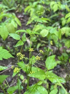 Thaspium trifoliatum is a perennial herbaceous plant in the carrot family, known for its compound leaves and small clustered flowers that vary in color from dark maroon to yellow.
