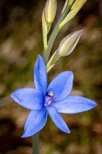 Thelymitra crinita is a terrestrial orchid species native to Australia, known for its striking blue flowers and hairy column crest.