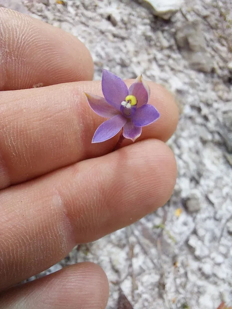 Thelymitra pauciflora is a terrestrial, tuberous orchid herb known for its slender stems and striking blue flowers.