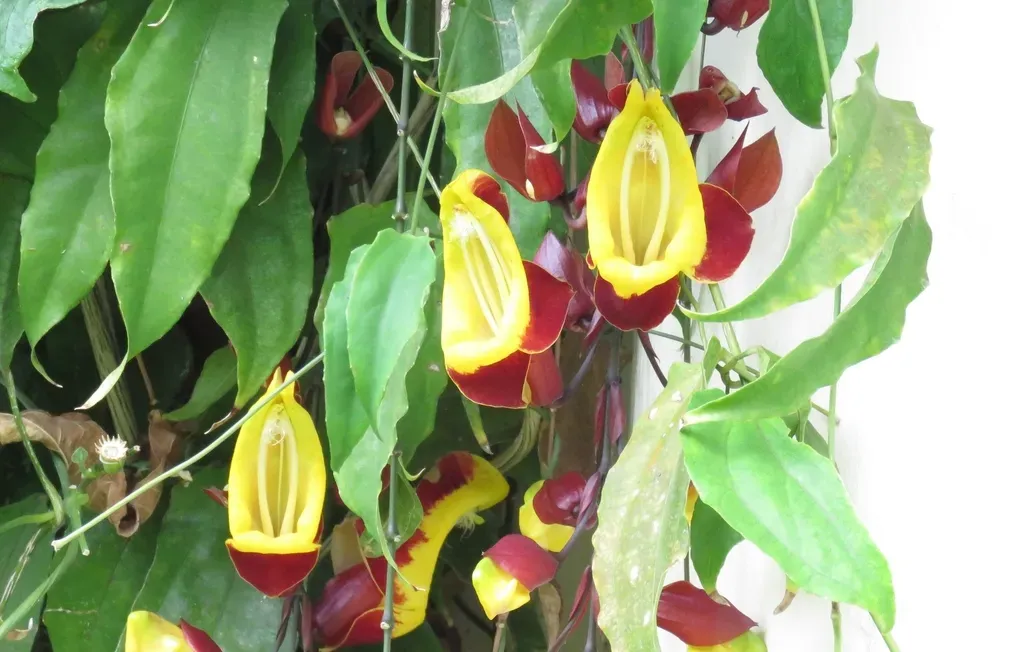 A vigorous evergreen climbing vine known for its spectacular pendulous racemes of tubular flowers with a striking yellow throat and dark red reflexed petals.