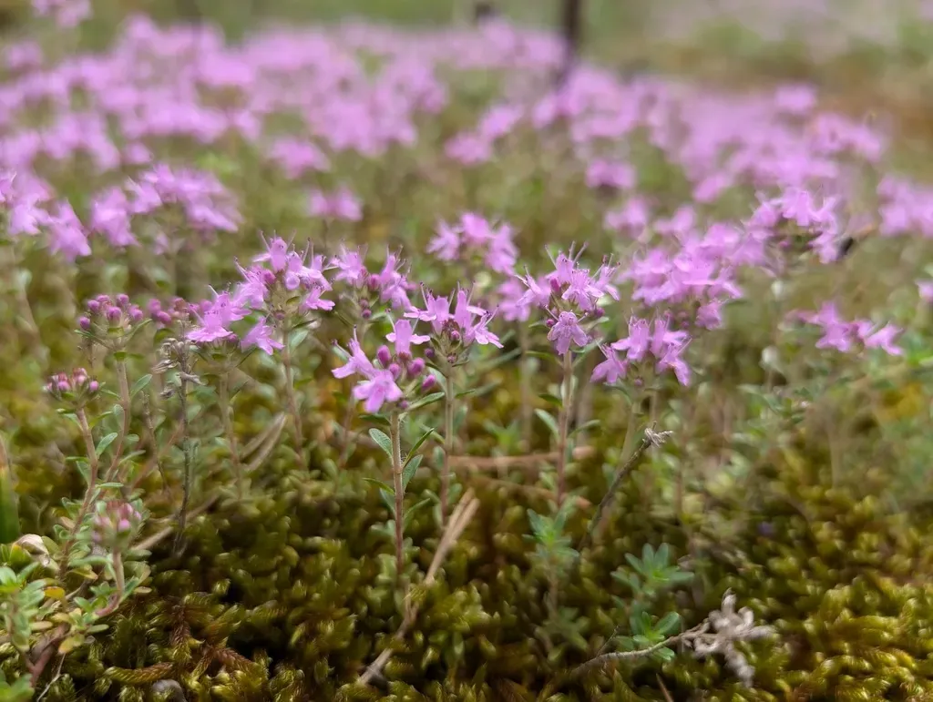 A low, mat-forming perennial herb with aromatic foliage and tiny purple-pink flowers, widely used as groundcover and for culinary purposes.