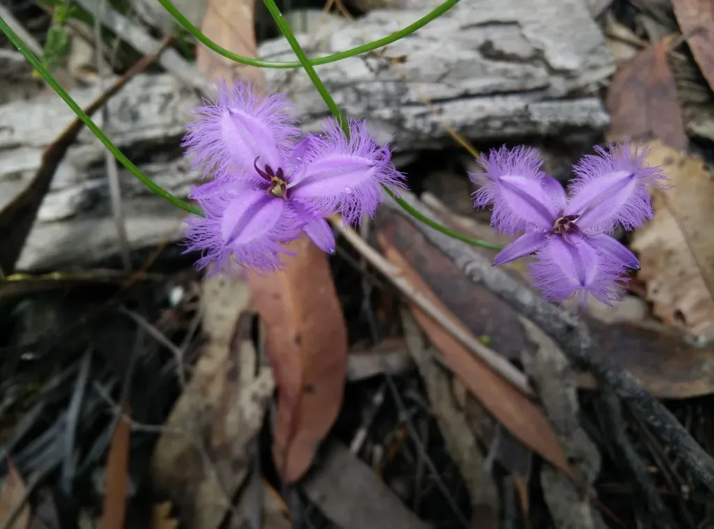 Thysanotus tuberosus is a perennial herb endemic to Australia, known for its distinctive fringed purple flowers and narrow linear leaves.