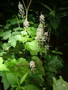 Tiarella cordifolia is a low-growing perennial native to eastern North America, prized for its attractive foliage and delicate white flower spikes.