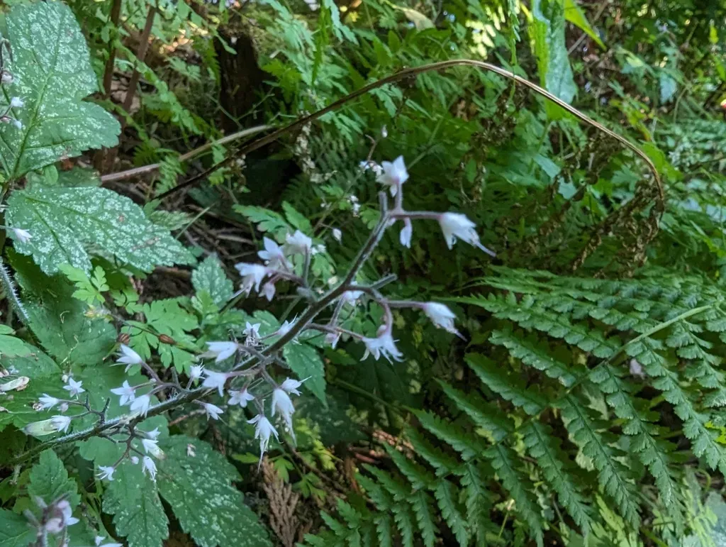 Tiarella trifoliata is a perennial herbaceous plant known for its attractive foliage and delicate white flowers, commonly found in moist forested areas.