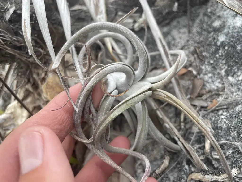 Tillandsia paucifolia is a bulbous epiphytic airplant known for its silvery-gray, succulent leaves and bright red inflorescence with purple tubular flowers.