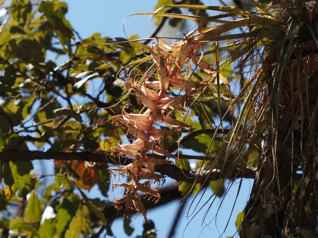Tillandsia prodigiosa is a striking epiphytic air plant native to Mexico, known for its large, colorful inflorescences and silvery-green strap-like leaves.