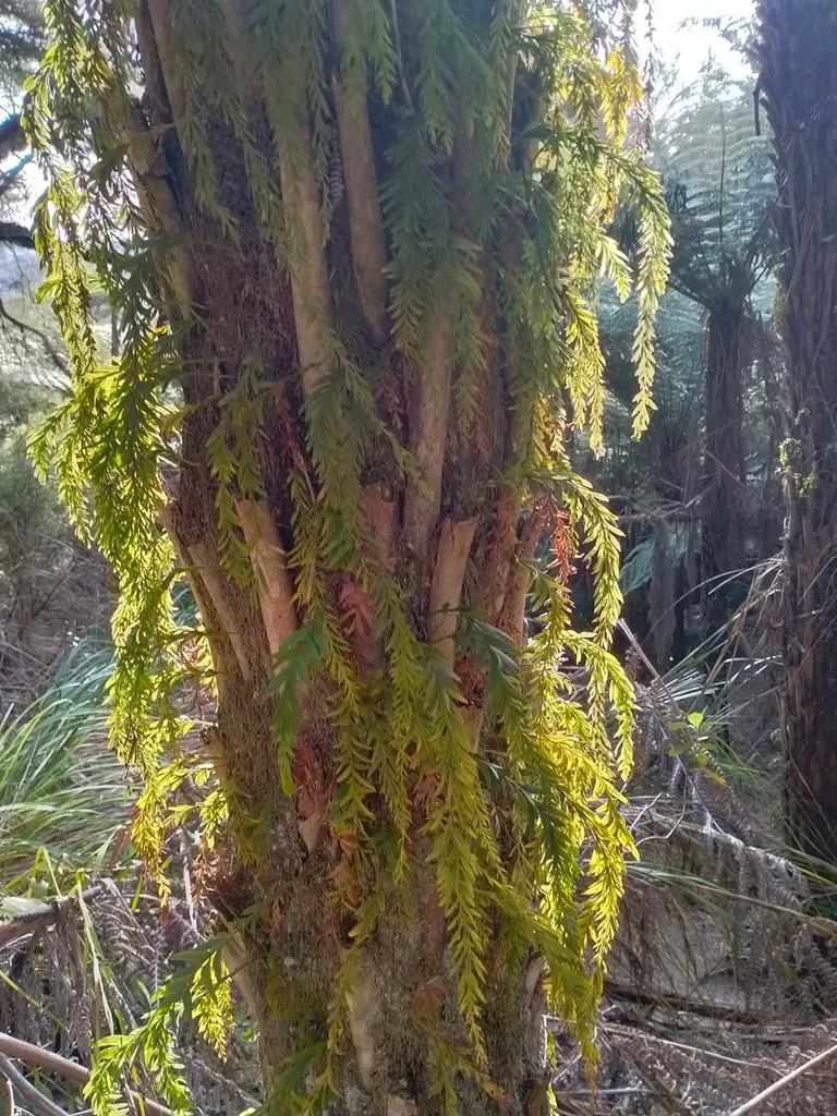 Tmesipteris elongata is a fern ally endemic to southeastern Australia and New Zealand, commonly growing epiphytically on soft tree ferns in moist valleys.