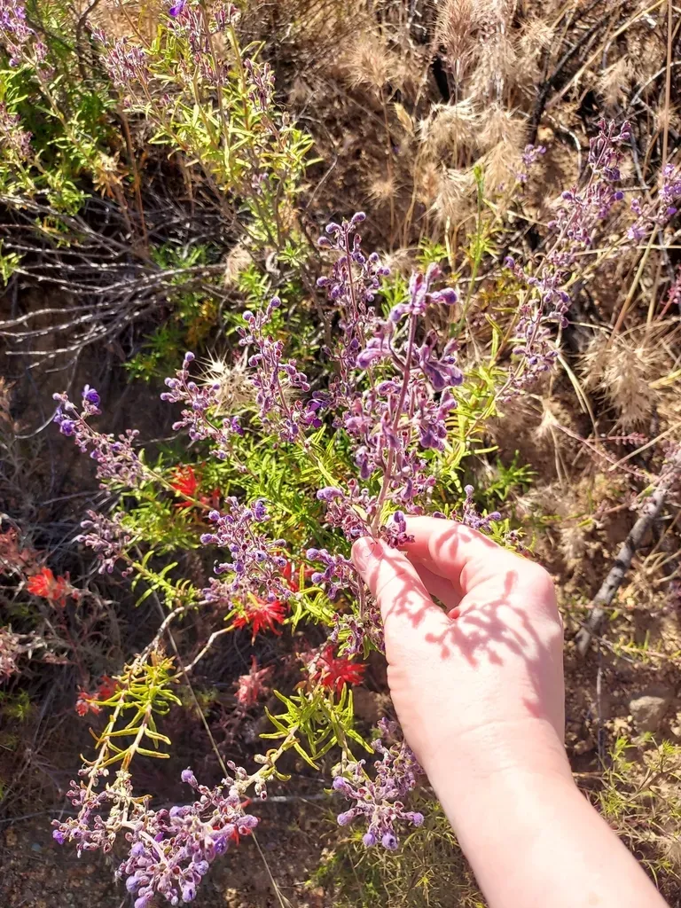 Trichostema parishii is a perennial shrub native to California, known for its aromatic herbage and blue flowers.