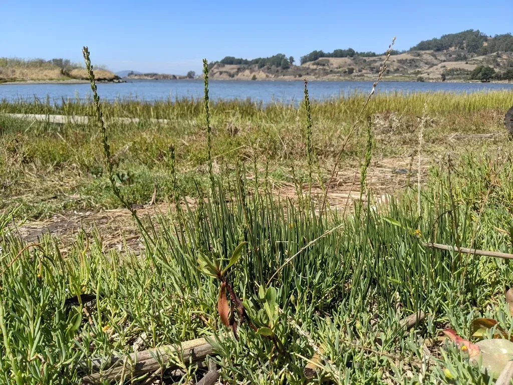 Triglochin maritima is a perennial herbaceous plant native to coastal salt and brackish marshes, recognized by its grass-like leaves and dense clusters of small flowers.