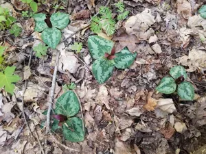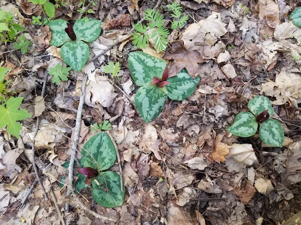 Trillium decumbens is a perennial herbaceous plant known for its distinctive decumbent (lying flat) leaves and dark maroon, twisted flower petals.