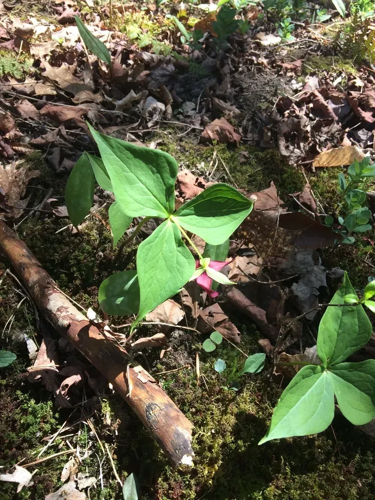A perennial woodland wildflower native to eastern North America, known for its distinctive three-petaled maroon to red flowers and whorled leaves.