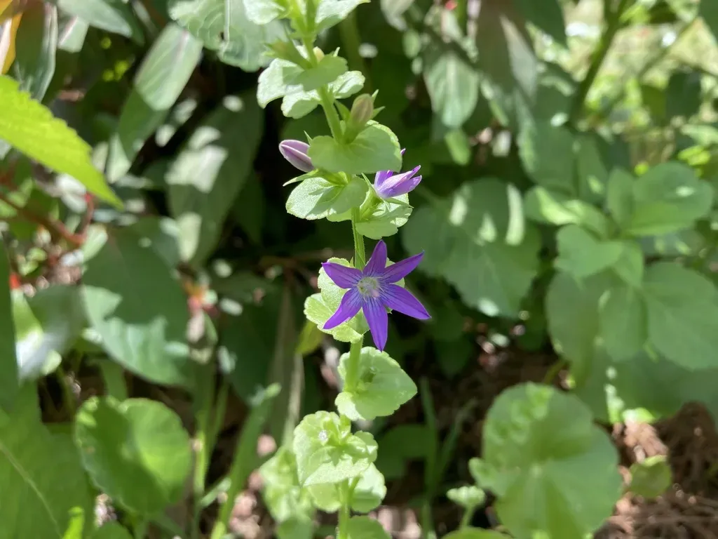 An annual herb with purple, bell-shaped flowers that clasp the stem with heart-shaped leaves.