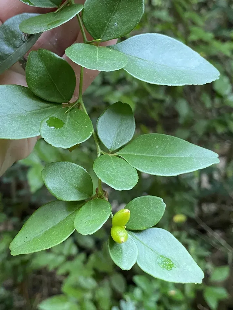 Triphasia trifolia is an evergreen shrub or small tree known for its edible lime-like berries and glossy green leaves.