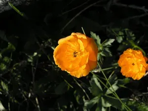 Trollius altaicus is a perennial herbaceous plant native to Central Asia, Altay, Western Mongolia, and Northern Japan, known for its large, bright orange-yellow flowers and preference for wet habitats.