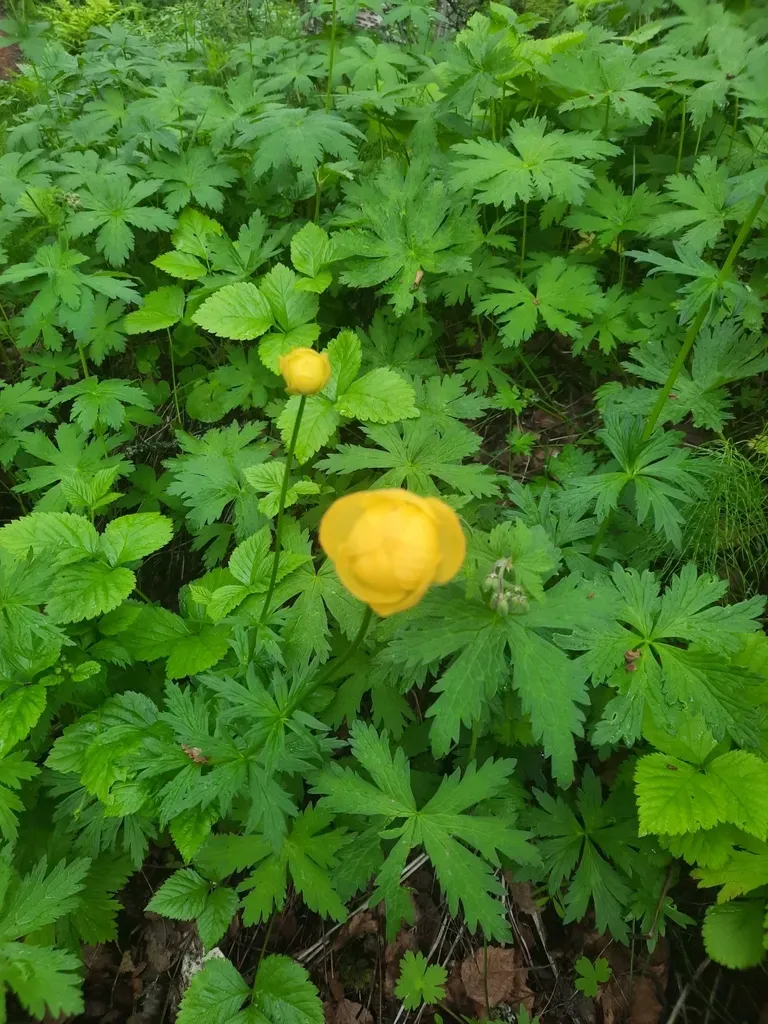 Trollius europaeus, commonly known as Globe Flower, is a perennial herbaceous plant with showy, spherical yellow flowers.