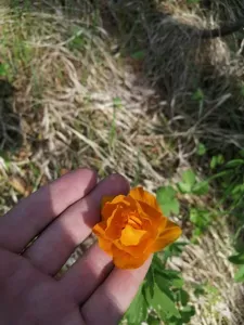 Trollius kytmanovii is a perennial herbaceous plant known for its bright orange globular flowers and lush green foliage, native to Siberia and Mongolia.