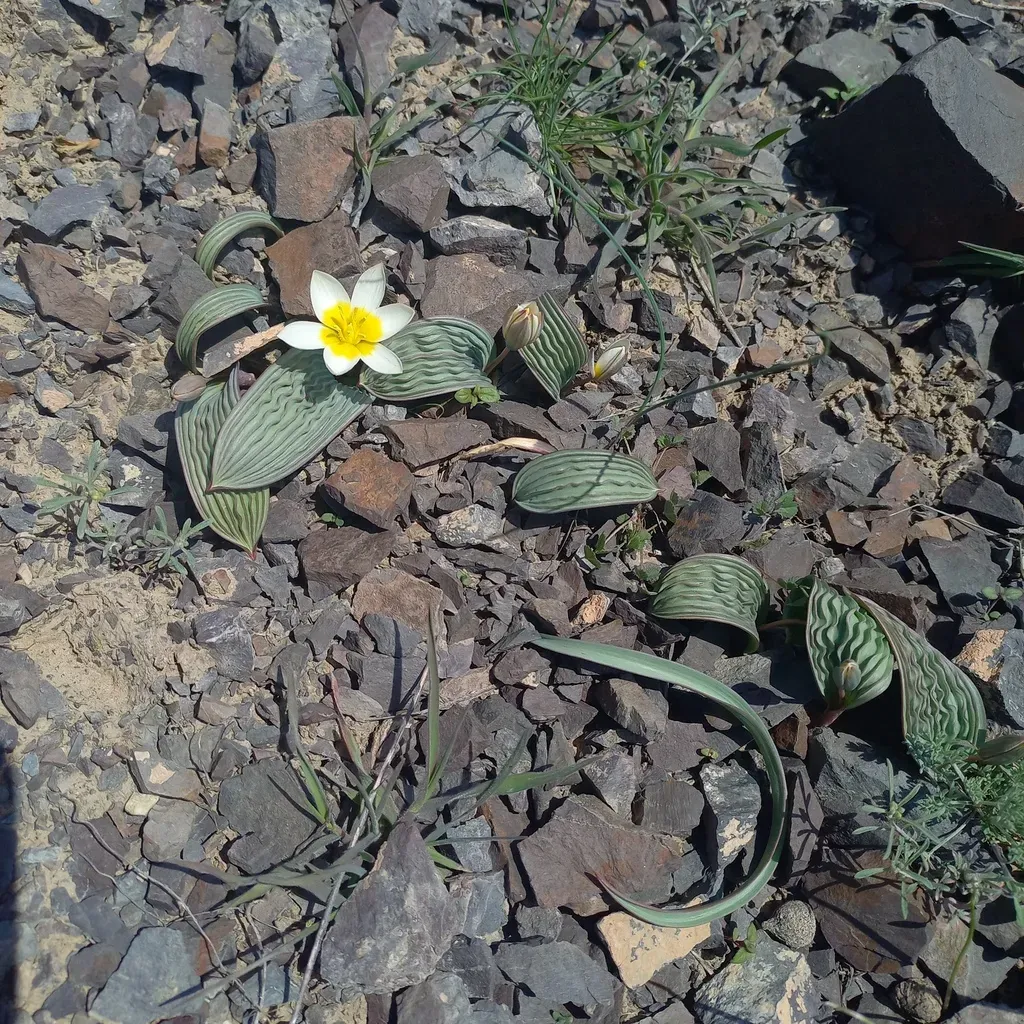 Tulipa regelii is a rare species of tulip native to southeast Kazakhstan, known for its unique solitary prostrate leaf with ridges and furrows.