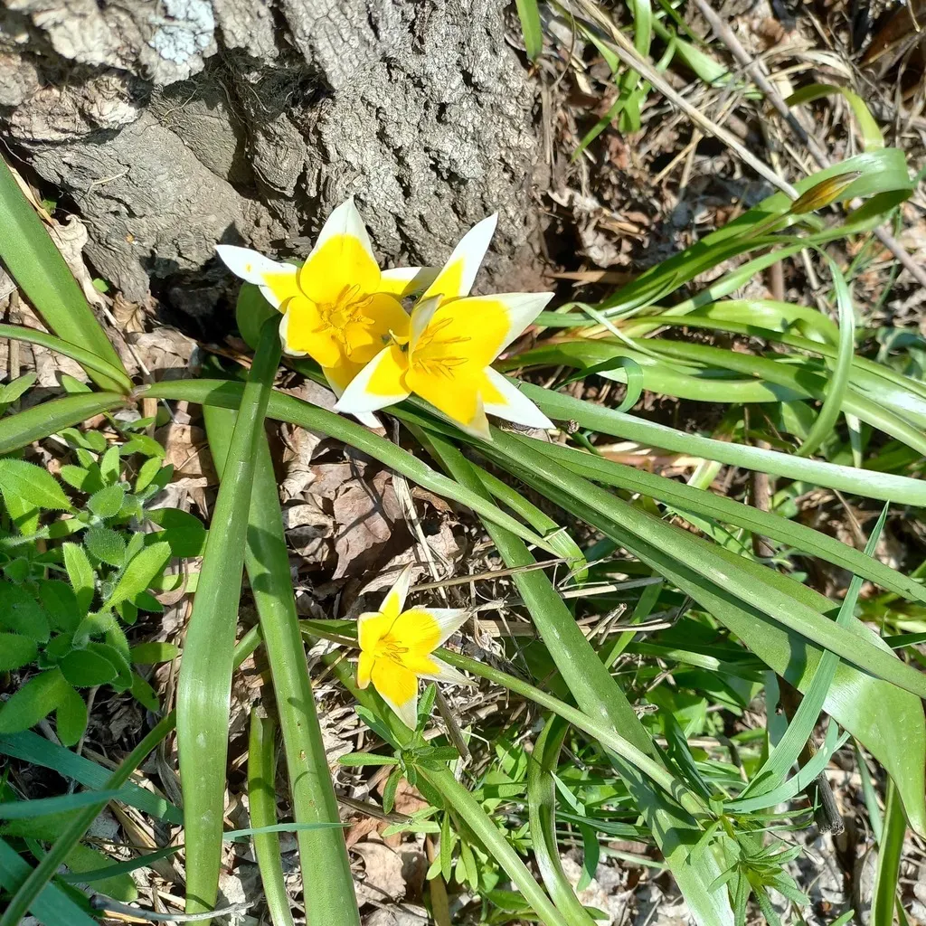 A dwarf, bulbous perennial tulip with star-shaped, bright yellow flowers edged in white, native to Iran and Central Asia.