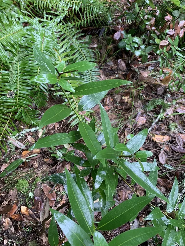 Umbellularia californica is a broadleaf evergreen tree or shrub native to the west coast of North America, known for its aromatic leaves and dense, rounded habit.