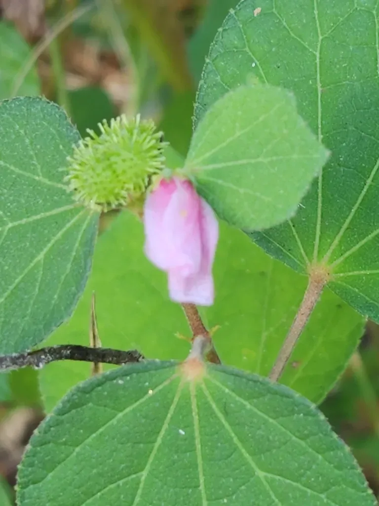 Urena lobata is a perennial shrub or subshrub known for its distinctive palmate leaves and pink to purple flowers, often considered a weed but also cultivated for fiber.