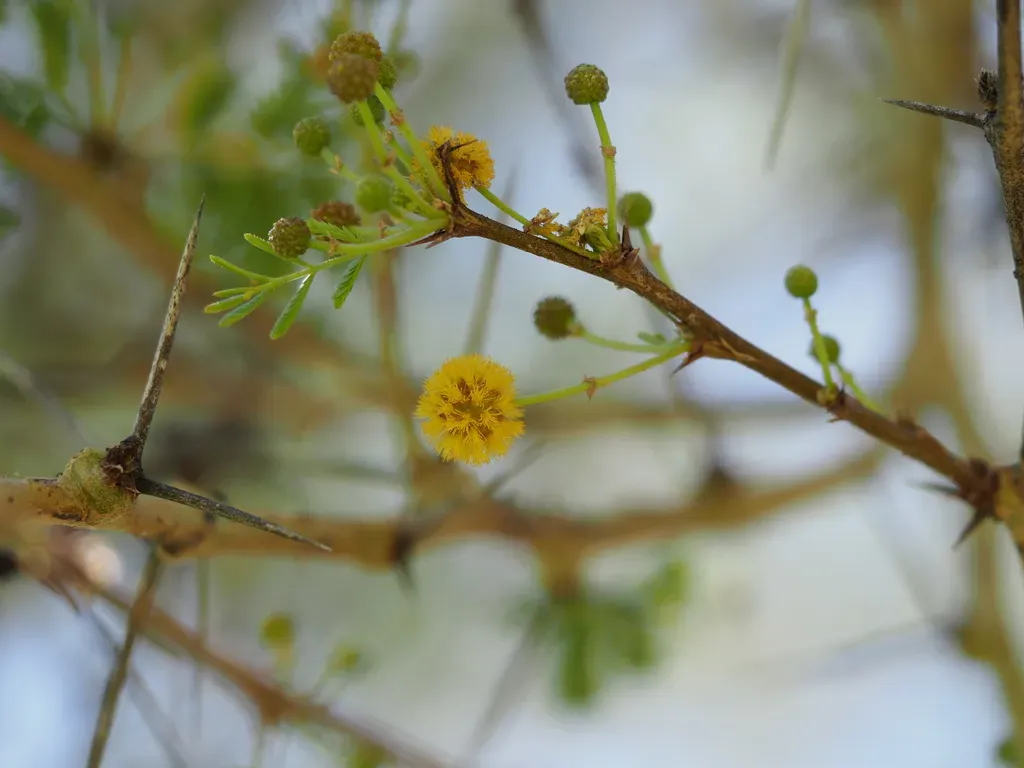 Vachellia karroo is a highly variable, thorny, evergreen shrub or tree native to southern Africa, known for its rounded crown, bright yellow flowers, and distinctive paired thorns.