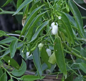 Vallesia glabra is a multi-stemmed evergreen shrub or small tree native to tropical America, known for its shiny bright green leaves, white flowers, and bright white fleshy berries.