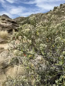 A large, multi-trunked evergreen shrub or small tree native to the southwestern United States and northern Mexico, known for its dense, leathery foliage and white flowers.