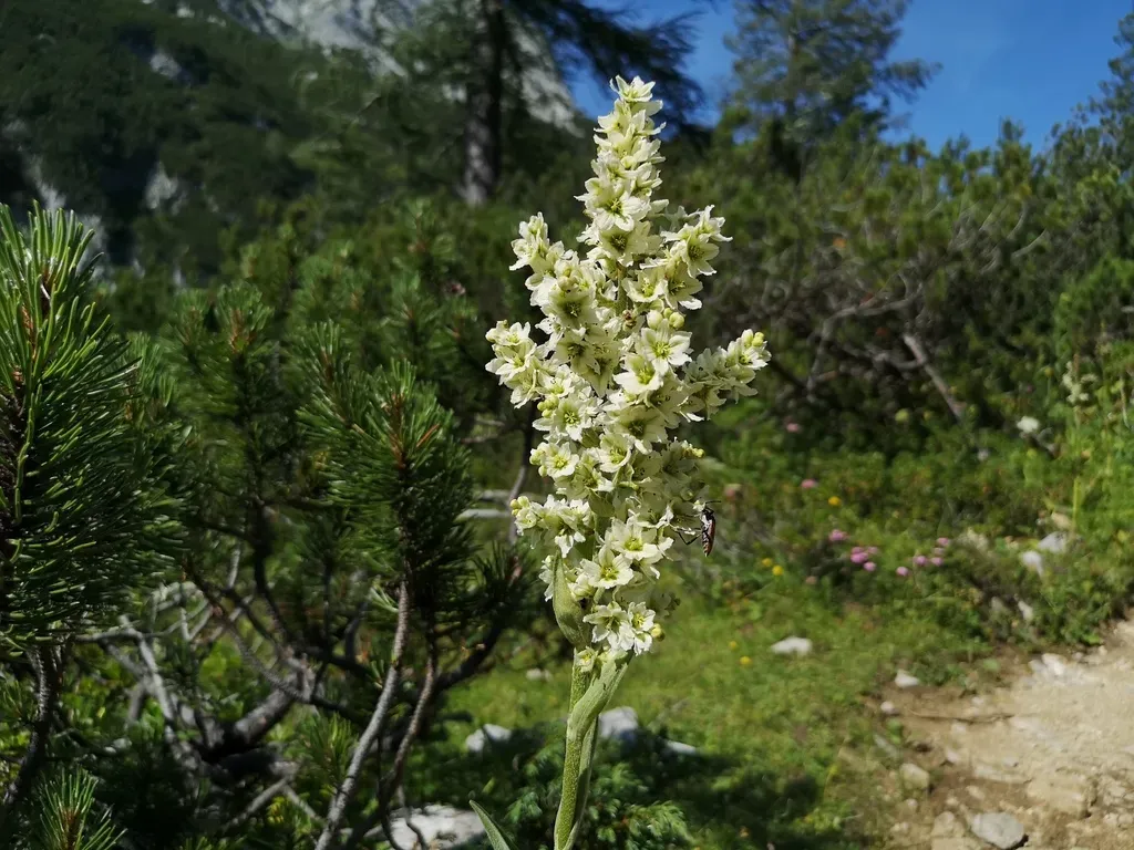Veratrum album is a tall, herbaceous perennial plant with white to yellowish-green flowers and large pleated leaves.