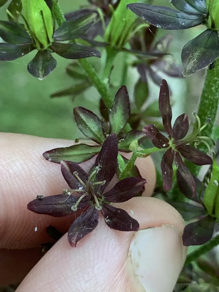Veratrum woodii is a perennial herbaceous plant characterized by tall, erect stems and dark maroon to blackish purple flowers.