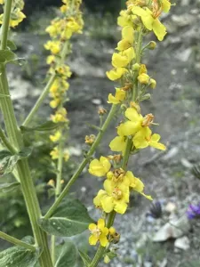 Verbascum pyramidatum is a tall, striking perennial characterized by densely packed spikes of pale yellow, saucer-shaped flowers with purple stamens.