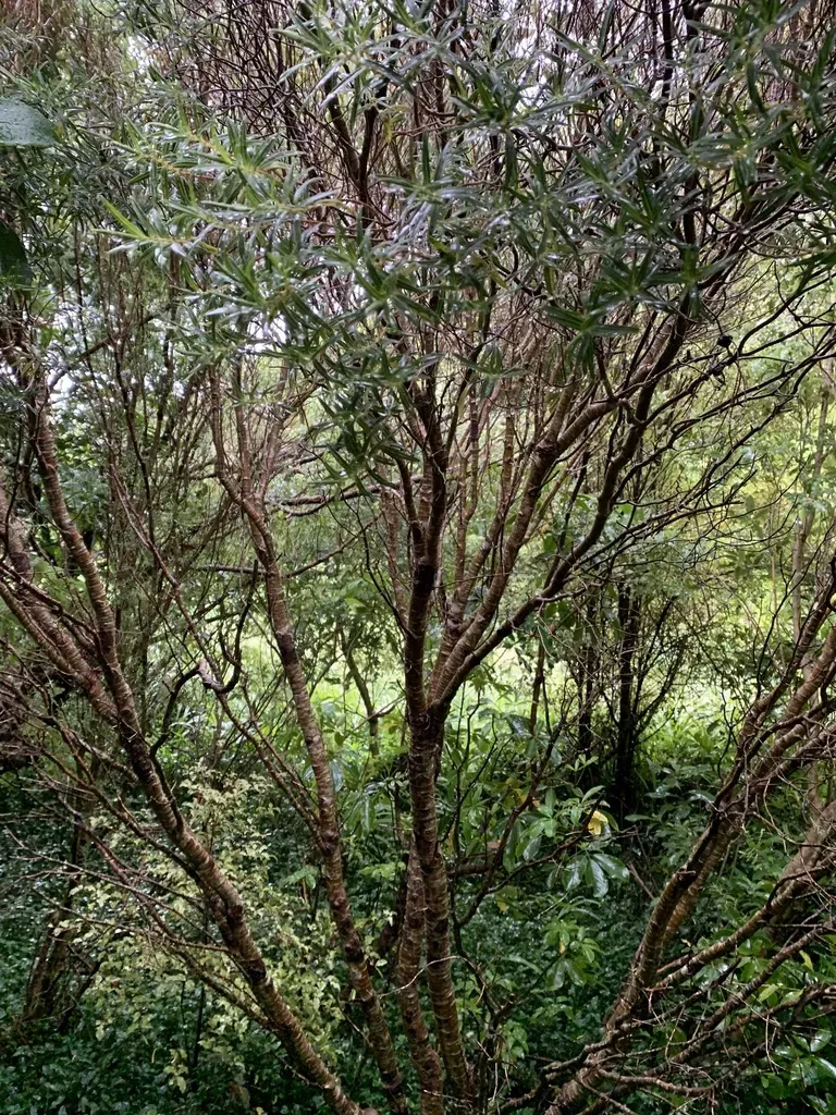 A rounded, evergreen shrub or small tree native to New Zealand, growing up to 12 meters tall with erect branches and narrow lance-shaped leaves.