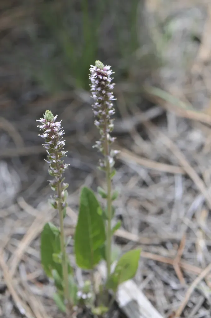 Veronica plantaginea is a perennial herbaceous plant known for its basal rosettes of hairy, ovate to elliptic leaves and small blue-purple flowers.