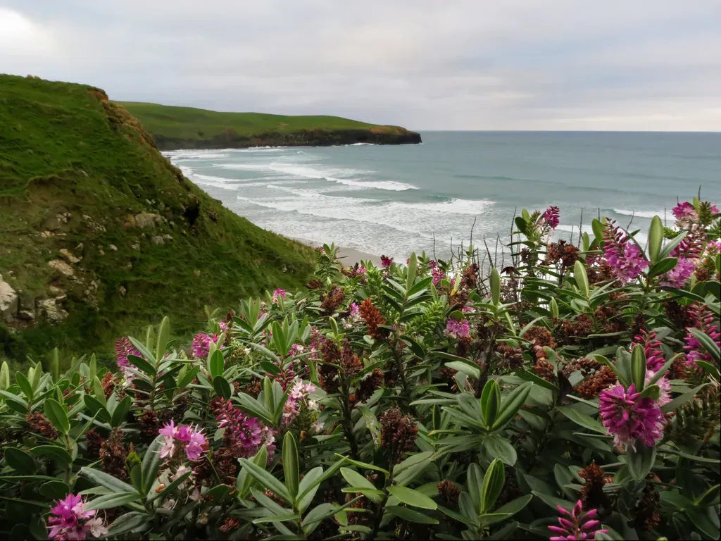 An evergreen shrub native to New Zealand, known for its glossy dark green leaves and vibrant magenta flower spikes.