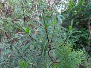 Veronica strictissima is a bushy shrub endemic to Banks Peninsula, New Zealand, known for its narrow dark green leaves and spikes of white flowers.