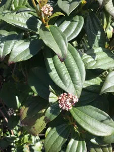 Viburnum davidii is a low, compact, evergreen shrub known for its glossy, large oval leaves and year-round ornamental interest.