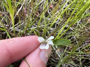 Viola lanceolata is a perennial herbaceous plant known for its white flowers with purple veins on the lower petal and narrow lance-shaped leaves. It commonly inhabits bogs, marshes, and wet sandy or peaty soils.