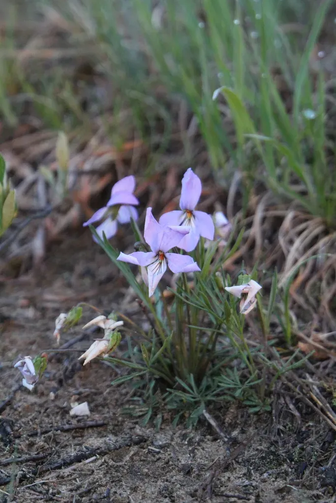 Viola pedata is a native herbaceous perennial violet with deeply divided leaves resembling a bird's foot and striking purple flowers with orange centers.