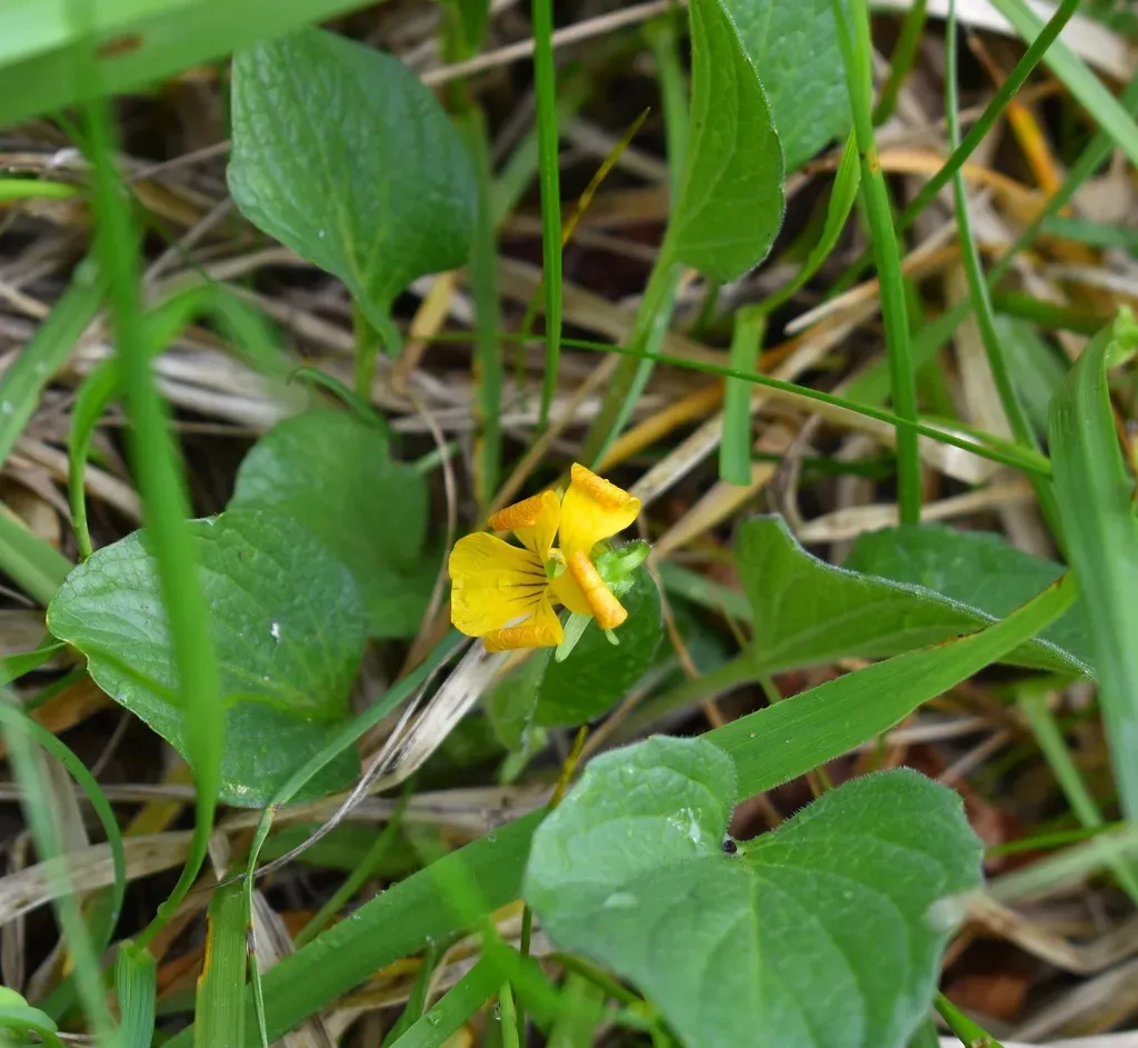 Viola praemorsa is a perennial herbaceous plant known for its bright yellow flowers with distinctive black whiskers on the lower petal.